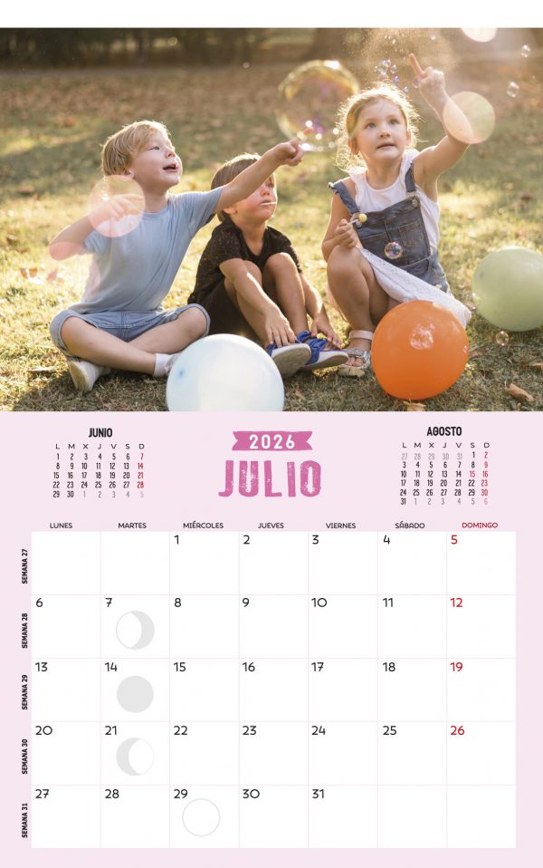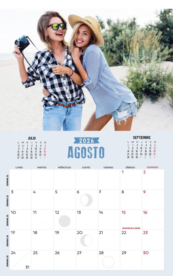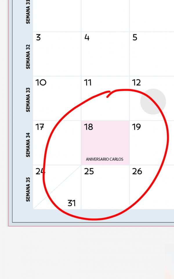 También puedes incluir GRATIS 3 fechas señaladas para ti. Ejemplo: 18 de Agosto: ANIVERSARIO CARLOS (y lo escribiremos en ese espacio, destacando además el cuadrito del día)