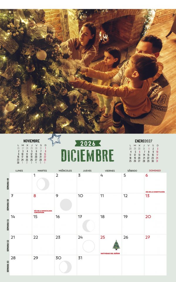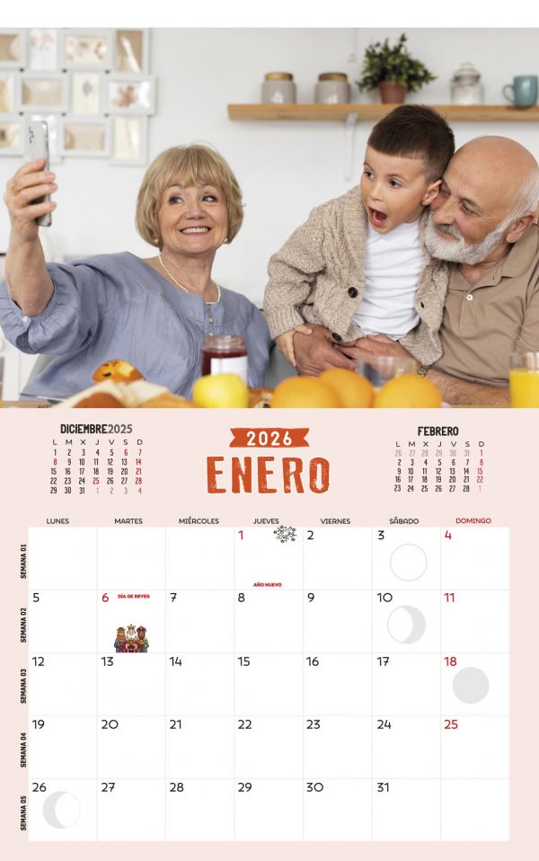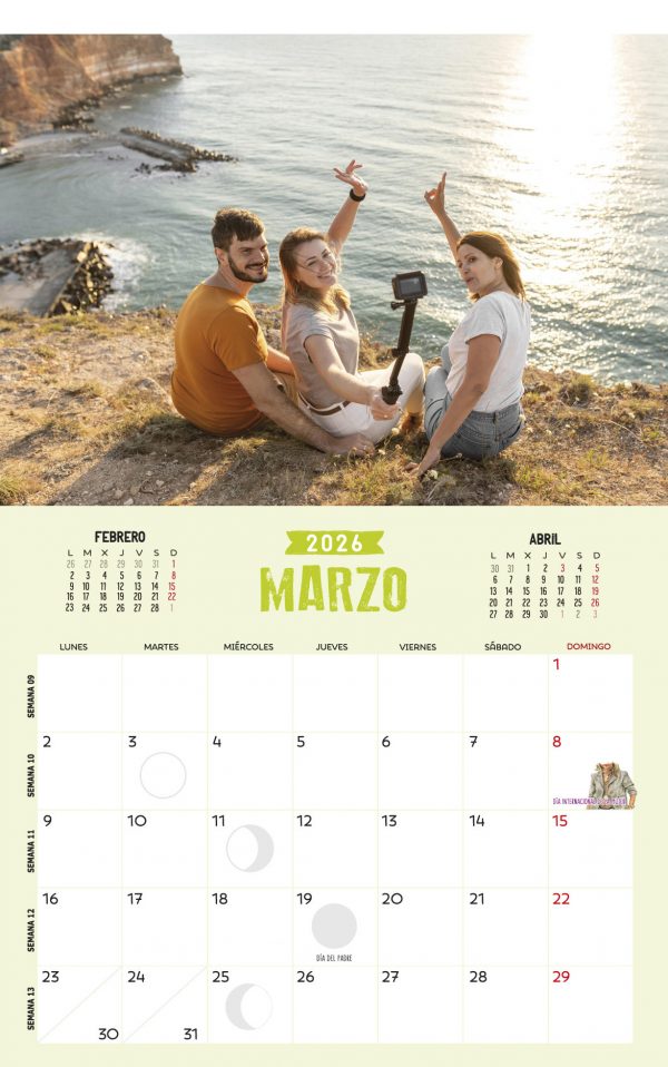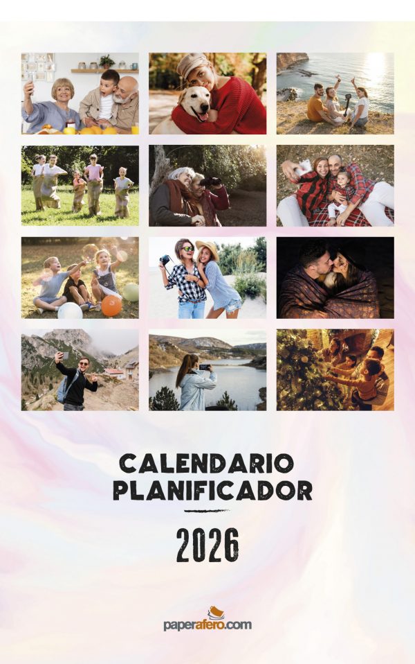 Calendario de pared vertical tamaño 297x475mm impreso a todo color sobre papel ofset de 200g extrablanco, perfecto para escribir notas. Acabado en wire-o negro con colgador. Incluye página de notas y todas las fotos personalizadas pequeñas en la portada.
